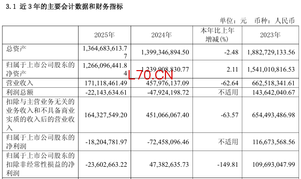 公告称,根据《股票上市规则》第9.3.2条第一款第(一)项规定:“(一)最近一个会计年度经审计的利润总额、净利润或者扣除非经常性损益后的净利润孰低者为负值且营业收入低于3亿元,或追溯重述后最近一个会计年度利润总额、净利润或者扣除非经常性损益后的净利润孰低者为负值且营业收入低于3亿元”,公司股票在2025年度报告披露后将被实施退市风险警示(在公司股票简称前加“*ST”)。