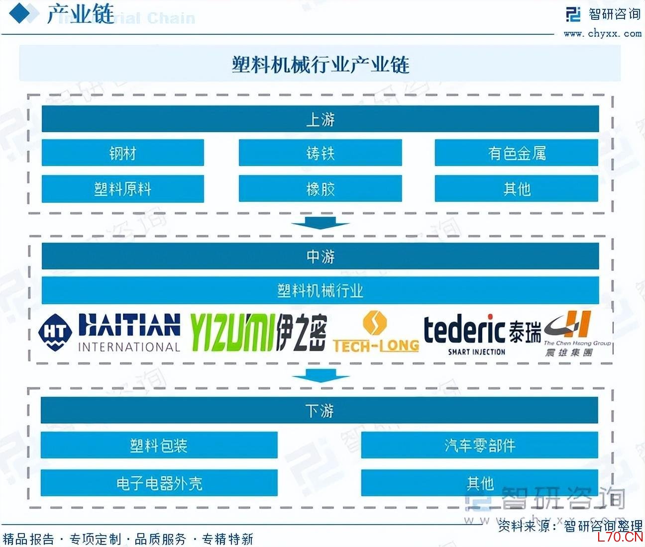从产业链来看,塑料机械产业链上游为金属材料及高分子材料供应,包括钢材、铸铁、有色金属、塑料原料、橡胶等。产业链中游为塑料机械的生产制造商,生产出各种塑料机械产品,如注塑机、挤出机、吹塑机等。产业链下游为塑料制品制造商,他们使用塑料机械来生产各种塑料制品,包括塑料包装、汽车零部件、电子电器外壳等。