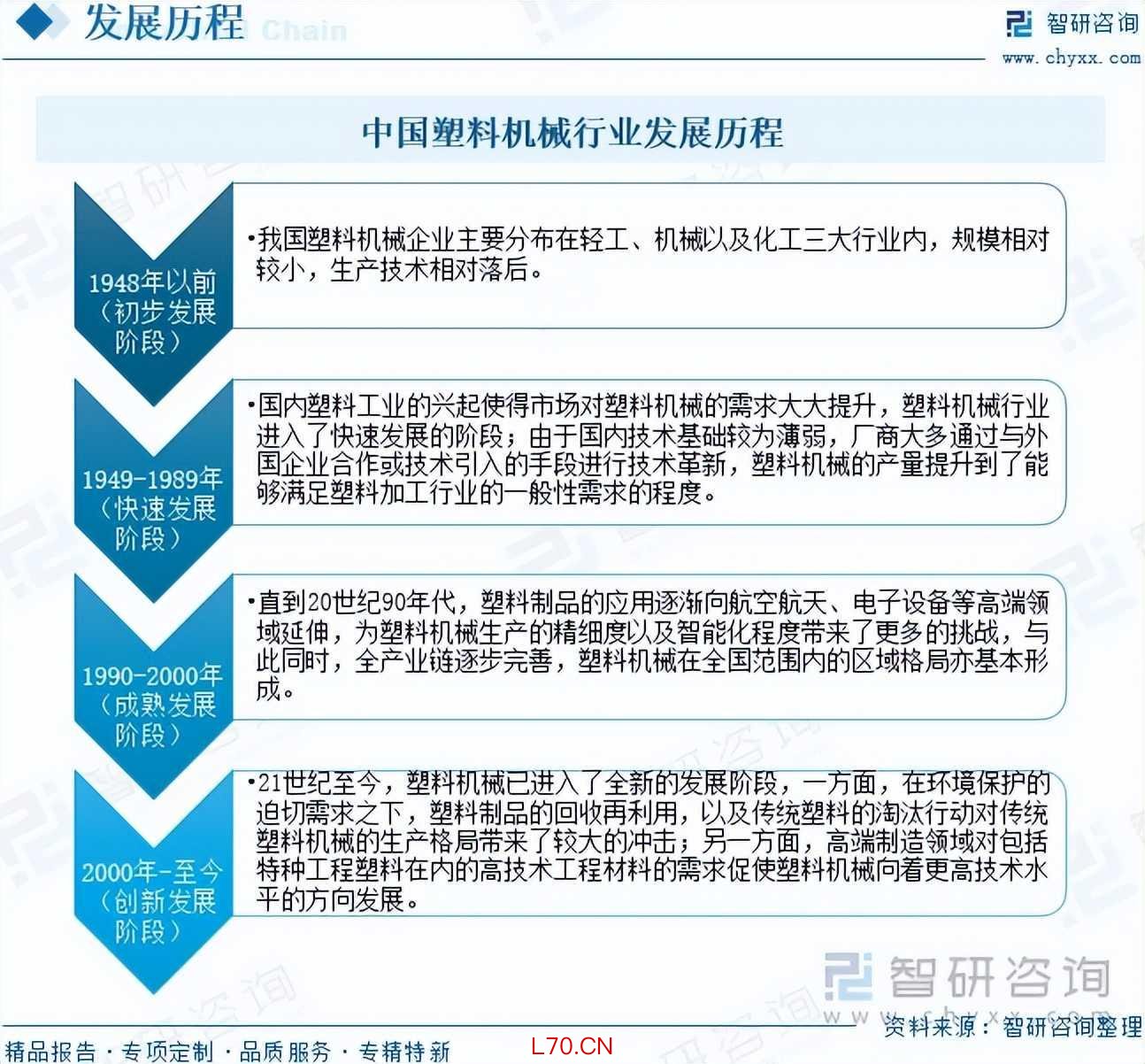 元股证券中国塑料机械行业发展经历了四个阶段,分别是1948年以前的初步发展阶段、1949-1989年的快速发展阶段、1990-2000年的成熟发展阶段以及2000年至今的创新发展阶段。1948年以前,我国塑料机械企业主要分布在轻工、机械以及化工三大行业内,规模相对较小,生产技术相对落后。进入快速发展阶段,国内塑料工业的兴起使得市场对塑料机械的需求大大提升,塑料机械行业进入了快速发展的阶段;由于国内技术基础较为薄弱,厂商大多通过与外国企业合作或技术引入的手段进行技术革新,塑料机械的产量提升到了能够满足塑料加工行业的一般性需求的程度。直到20世纪90年代,塑料制品的应用逐渐向航空航天、电子设备等高端领域延伸,为塑料机械生产的精细度以及智能化程度带来了更多的挑战,与此同时,全产业链逐步完善,塑料机械在全国范围内的区域格局亦基本形成。21世纪至今,塑料机械已进入了全新的发展阶段,一方面,在环境保护的迫切需求之下,塑料制品的回收再利用,以及传统塑料的淘汰行动对传统塑料机械的生产格局带来了较大的冲击;另一方面,高端制造领域对包括特种工程塑料在内的高技术工程材料的需求促使塑料机械向着更高技术水平的方向发展。