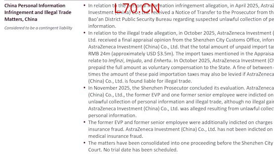 阿斯利康中国以及阿斯利康两位前高管,被深圳检方提起公诉相关案件由深圳市中级人民法院合并审理。