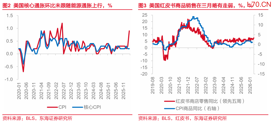 核心观点:美国3月整体通胀数据在市场预期内上行,汽油价格的上涨是当月通胀的主要贡献项,但能源价格的上行并没有立即传导至核心通胀上。我们认为原因其一是能源通胀传导至商品端具有时滞性;其二是能源通胀对于消费端的“反身性”,即高通胀预期反而压制消费和投资行为,从而弱化其对核心通胀的影响,这一点从3月初略有走弱的红皮书商品销售情况亦能反映。后续来看,我们认为受中东冲突缓和影响,油价短期继续上行空间较小,对美国后续整体通胀推升较为有限。同时,由于密歇根大学调查统计的消费者通胀预期(初值)在4月存在明显升温迹象,我们认为4月美国或依然出现需求对价格承接乏力的情况。但就住房价格方面需要注意到的一点是,2025年10月租金采集的空缺导致价格指数存在显著低估,而半年轮换采样机制使得2026年4月住房价格增速或存在补偿性升高情况,或对美国通胀有一定技术性的上行压力。整体来看,美国3月通胀符合预期,核心通胀依然保持温和,市场小幅加强美联储年内降息的可能性。我们维持美联储上半年按兵不动的观点,下半年沃什上任美联储主席叠加特朗普中期选举的政治诉求或为美国带来降息机会。