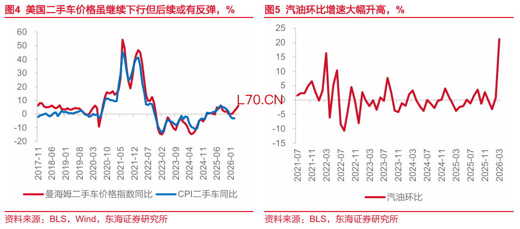 核心商品价格或因需求承压影响而保持稳定。核心商品价格3月环比增速保持在0.1%,同比略微升高至1.2%,前值1.0%。服饰价格增速出现边际收敛的迹象,环比由前值1.8%下降至1.1%,同比由2.5%升高至3.4%。新车价格依然保持稳定,环比价格增速小幅上行至0.1%,或显示关税传递效应正在逐渐减弱。二手车价格增速维持在低位-0.4%不变,不过曼海姆二手车价格指数显示后续依然或有上行压力。整体来看,3月能源价格的上行并没有立即传导至核心商品上。我们认为原因其一是能源通胀传导至商品端具有时滞性;其二是能源通胀对于消费的反身性,即高通胀预期反而压制消费和投资行为,从而弱化其对核心通胀的影响,这一点从3月初略有走弱的红皮书商品销售情况亦能反映。同时,由于密歇根大学调查统计的消费者通胀预期(初值)在4月存在明显升温迹象,我们认为4月美国或依然出现需求对价格承接乏力的情况。