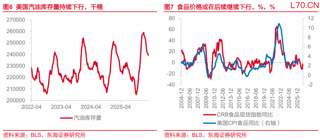 3月汽油价格是通胀上升的主要推手,食品项价格或有进一步下行空间。3月能源价格环比升10.9%,其中能源商品环比上涨21.3%,汽油价格环比上升21.2%几乎贡献出全部涨幅,环比拉动当月通胀0.64个百分点。能源服务项下的电力和燃气则呈现出交叉走势:当月电力环比由上月-0.7%反弹至0.8%,而燃气环比增速大幅回落,由前值3.1%下降至-0.9%。同时,食品项价格回落明显,环比增速由前值0.4%下行至0%,同比下行至2.7%,而CRB食品指数则显示该分项或在后续存在进一步下行空间。