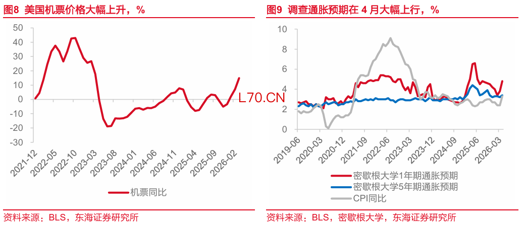 核心服务继续下行,但须警惕4月住房市场技术性反弹。3月核心服务价格增速并没有因天气回暖而反弹,反而出现增速进一步放缓的迹象,环比由前值0.3%下行至0.2%。娱乐为主要拖累项,当月下跌0.4%,前值跌0.2%,或显示居民额外消费意愿进一步减弱。交通服务反弹较为明显,其中运输服务价格环比由0.2%上行至0.6%,同比由2.2%上行至4.1%。机票价格受油价推升影响而大幅走高,环比升高至14.9%,为2023年4月以来的最高值。除此之外,住房市场出现小幅反弹,符合前置指标MBA市场综合指数在3月内的回温态势。不过需要注意到的是,2025年10月租金采集的空缺导致当月价格指数存在显著低估,而半年轮换采样机制使得2026年4月住房价格增速或存在补偿性升高情况,或对美国后续核心服务通胀有一定技术性的上行压力。