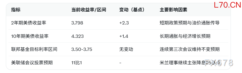 布朗兄弟哈里曼银行全球市场策略主管Elias Haddad在报告中表示:“市场普遍预计,美联储将连续第三次会议把联邦基金利率目标区间维持在3.50%至3.75%。”他指出,投票结果预计仍为11比1,理事米兰料将再次投下反对票,主张降息25个基点。据市场数据,2年期美债收益率上涨2.3个基点至3.798%,10年期美债收益率上升1.4个基点至4.323%。