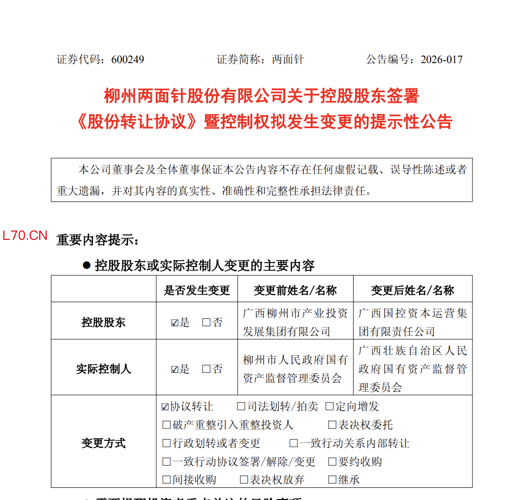 本次交易前,两面针实际控制人为柳州市人民政府国有资产监督管理委员会。本次交易完成后,公司控股股东将由产业集团变更为广西国控,实际控制人将由柳州市人民政府国有资产监督管理委员会变更为广西壮族自治区人民政府国有资产监督管理委员会。公司股票将于2026年4月1日开市起复牌。