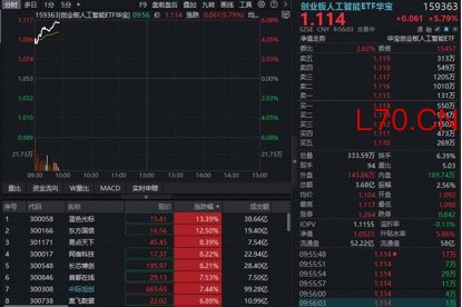 热门ETF方面,同类规模、流动性第一的创业板人工智能ETF华宝(159363)跳空飙升,场内价格摸高6%,放量成交超3.5亿元,量能或创近期新高。