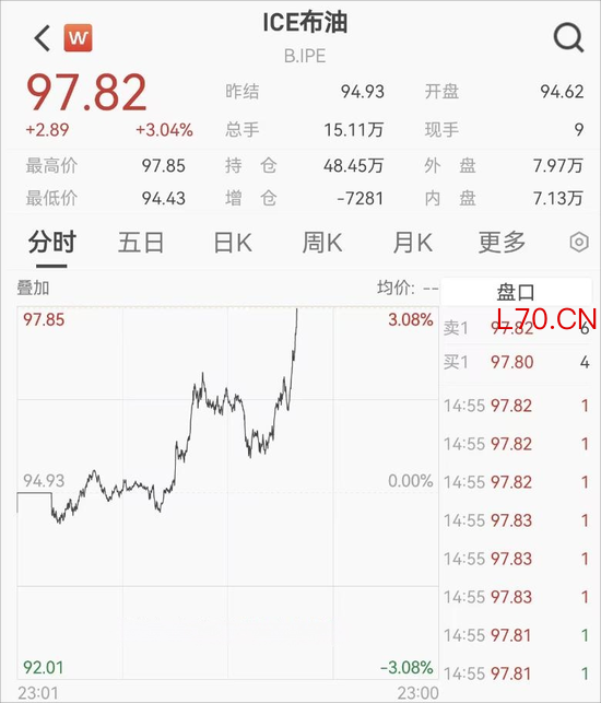 4月16日晚间,国际油价再度走强。布伦特原油直线拉升,截至发稿,报97.82美元/桶,日内涨幅超3%。