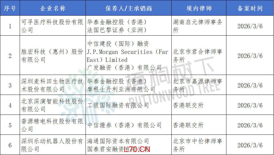 3月6日,中国证监会公开信息显示,可孚医疗科技股份有限公司、胜宏科技(惠州)股份有限公司、深圳麦科田生物医疗技术股份有限公司、北京深演智能科技股份有限公司、普源精电科技股份有限公司、深圳乐动机器人股份有限公司6家企业港股IPO获中国证监会备案。
