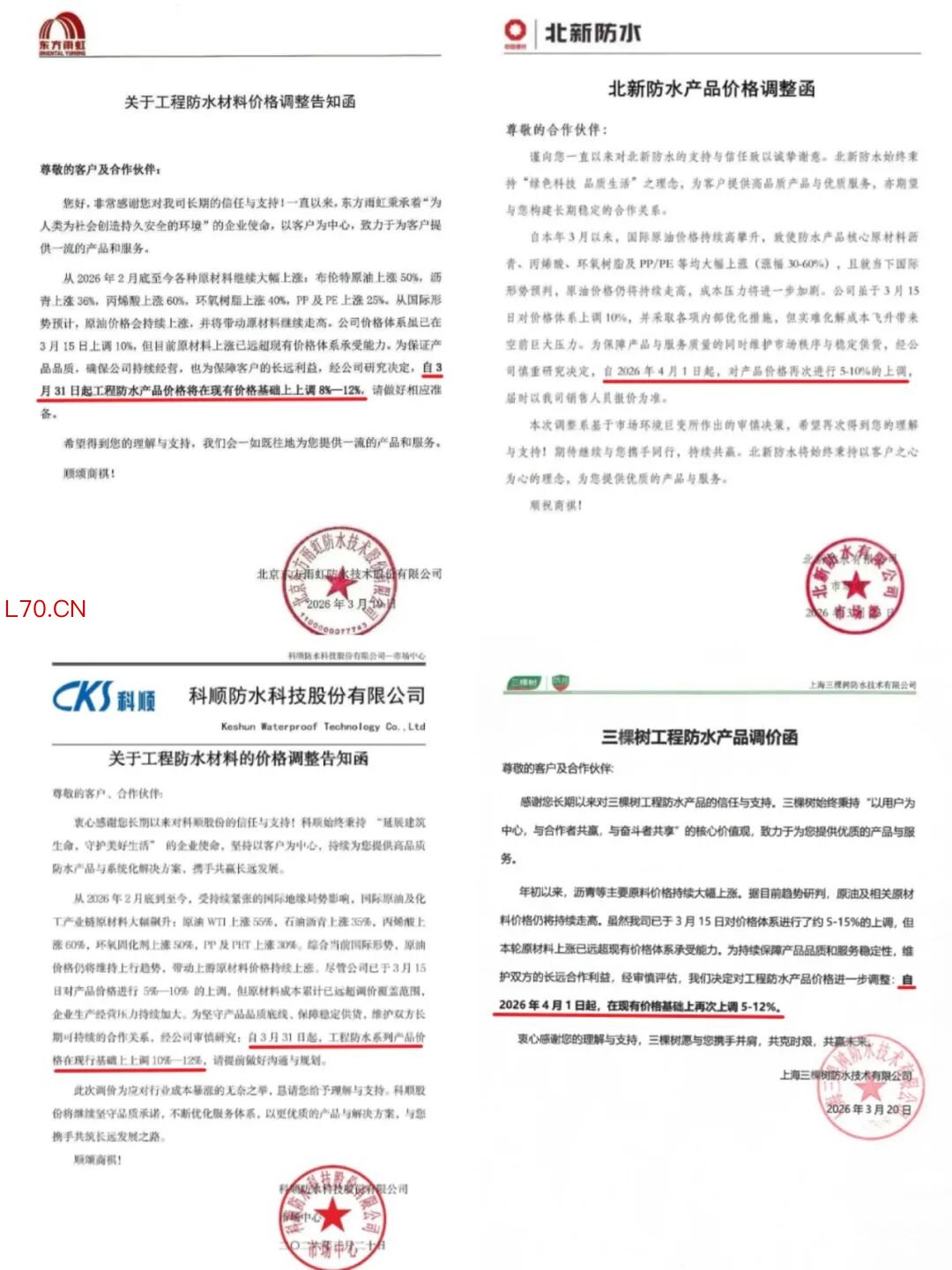 慧正资讯,3月中下旬,国内防水行业迎来第二轮涨价冲击波,东方雨虹、北新防水、科顺股份、三棵树防水四大龙头企业在首轮调价仅半月后,密集发布二次调价函。此番密集调价,既是上游原材料成本持续高企的传导结果,更成为防水行业摆脱低价内卷、重塑市场格局的重要契机,牵动着建筑、基建下游产业链的发展节奏。