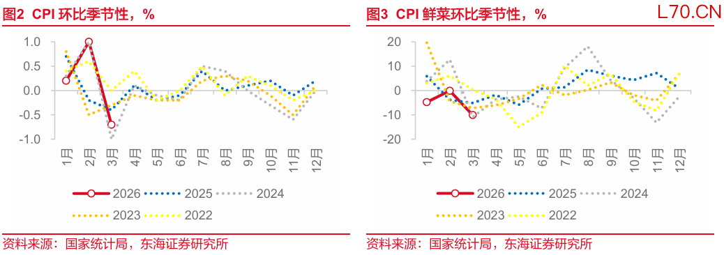 CPI环比基本符合季节性。CPI在春节后当月通常会环比负增长,今年也符合这一季节性规律。而与同样春节较晚的2015年、2018年、2021年、2024年相比较,3月环比-0.7%也基本符合积极性(以上4年同期均值-0.79%)。