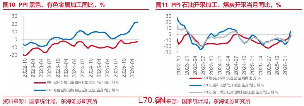 分行业看PPI。1.输入性价格传导(有色、原油)。与原油价格相关性较高的石油天然气开采业、石油煤炭及其他燃料加工业、化学原料和化学制品制造业3月环比涨幅分别为15.8%、5.8%、3.6%;有色金属加工环比1.0%,连续10个月上涨。2.建筑开工等需求提升带动。黑色金属加工开年以来连续3个月环比上涨,或反映基建增速回升的背景下用钢需求的提升。