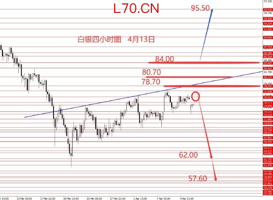 白银4月一直在小的区间内震荡,反弹力度也弱,符合预期。从图形来看,目前连78.70都没破,整体偏弱,还是保持月初思路不变,后市白银二次探底的概率相对较大些,上方多空分界线84.00区域,以下波段看跌,目标62.00和57.60区域。近期一直在斜向趋势线下方承压,所以本周继续关注此压力线,留意反转信号出现,建议右侧做空白银。只有成功站稳84.00上方后才能打开另一个上涨空间,向上测试94和101的概率才会加大,这是备选方案。本周建议逢高做空白银,给向下信号后右侧建仓,比较稳妥些。框架思路仅供参考,风险自负。