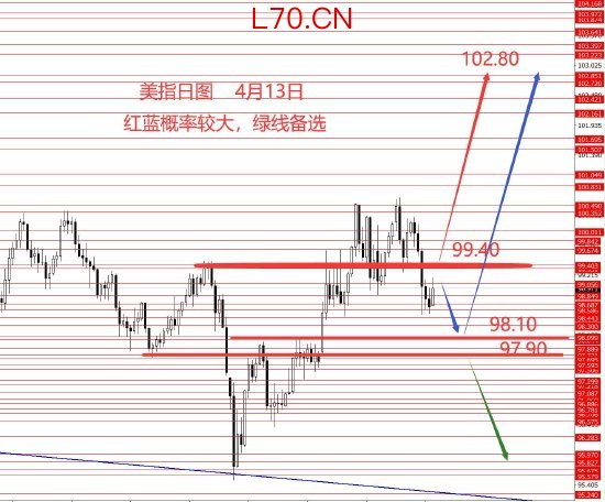 4月13日,美指上周分析错误,向下破位,周图收阴柱。从图形来看,美指成功跌破98.80强支撑2026炒股配资,收盘偏低,本周重点关键点99.40,以下偏向于看空,再关注下方98.10和97.90强支撑;若能站稳99.40上方,建议继续逢低做多美指,目标仍是102.80区域。目前在99.40-97.90区间建议灵活操作,此区域后市可上可下,都能解释得通。中线美指还是保持看涨思路不变,只是本周还要不要再深踩一下的问题,这是个人观点,今日没有具体操作建议,只有大概框架思路,仅供参考吧。