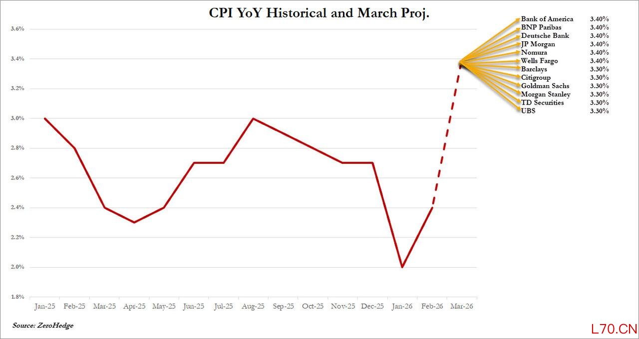 在同比方面,经济学家预测,这一环比涨幅将推动3月CPI同比上涨3.3%,也将创下2024年4月以来的最高水平。在2月,美国CPI同比涨幅为2.4%——这预示着前值与目前市场预期间,相差了近乎一个百分点……