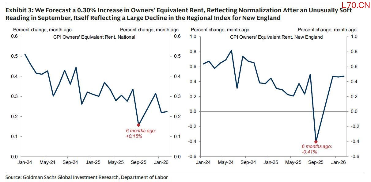 ②住房。高盛预测租金类别将环比增长0.20%,表现温和,反映出其潜在趋势的持续放缓。高盛预测业主等价租金(OER)类别将加速攀升至0.30%,反映出9月异常疲软读数反弹带来的上行压力,而该读数本身反映了新英格兰地区OER指数的较大幅度下降。
