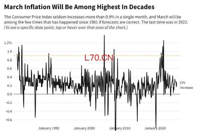 据媒体对经济学家的调查显示,经济学家预计定于周五发布美国CPI报告将显示,3月份美国通胀率将环比上升0.9%。