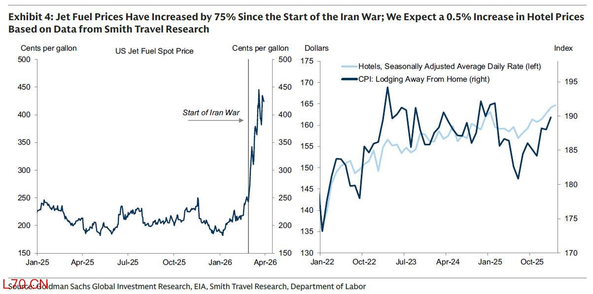 ③旅游服务。高盛预计3月旅游服务通胀强劲,部分反映了自伊朗战争开始以来油价上涨的传导效应。高盛预测机票价格环比上涨4%,部分反映了航空燃料价格的大幅上涨,以及3月酒店价格环比上涨0.5%,反映了替代价格数据的上升信号。