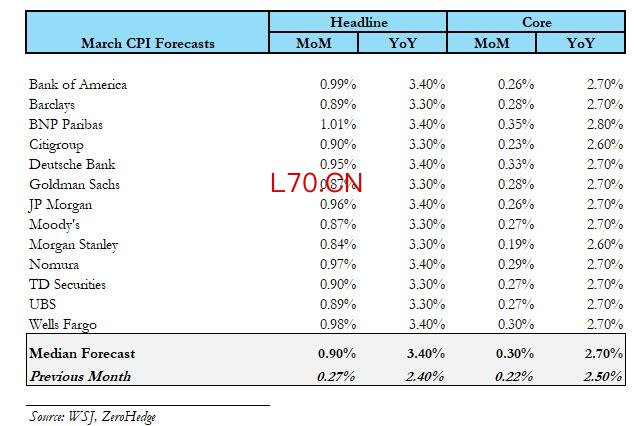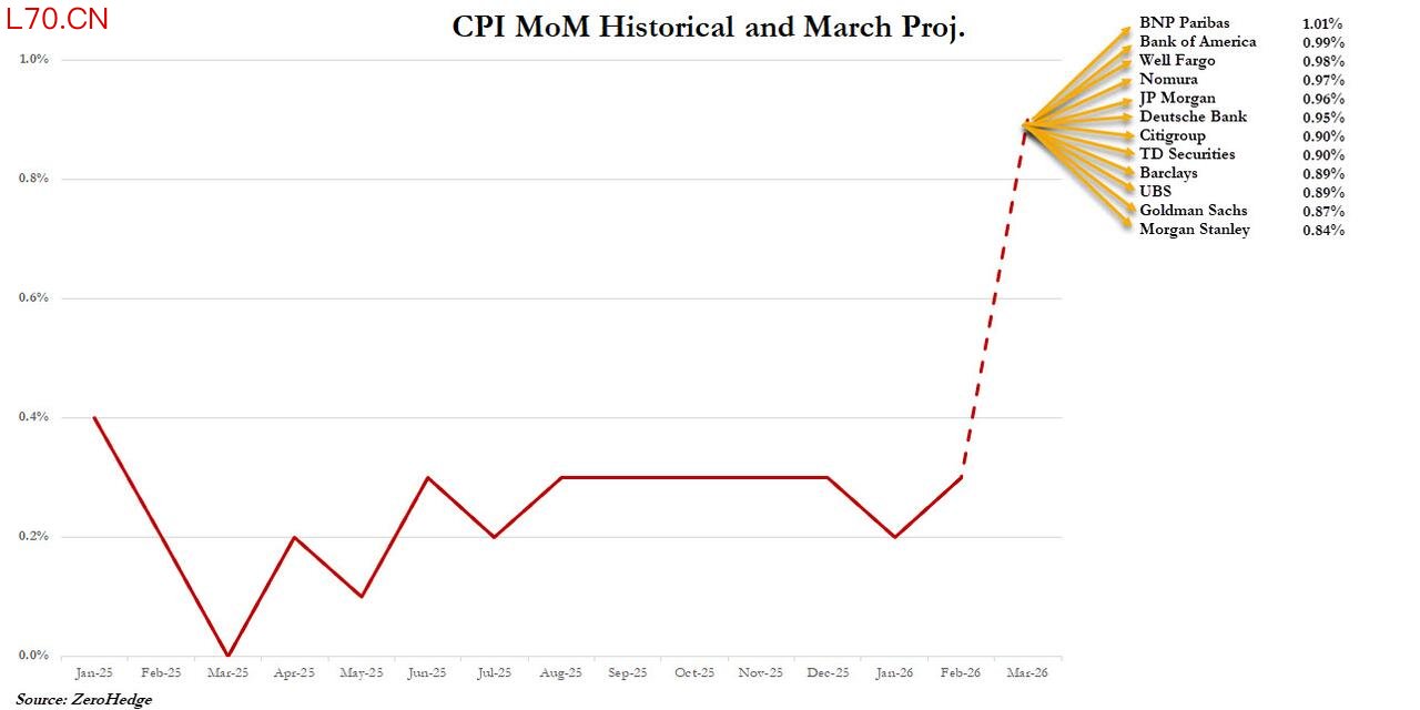 下图是目前华尔街投行对3月CPI环比数据的具体预测。可以看到,投行预估分布普遍在0.8%以上,部分机构预测环比涨幅可能“破1%”。