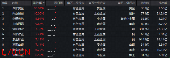成份股方面,西部黄金、兴业银锡涨停,华锡有色、山金国际涨逾9%,洛阳钼业、西部矿业、紫金矿业、湖南白银涨超7%,湖南黄金、中稀有色等个股跟涨。