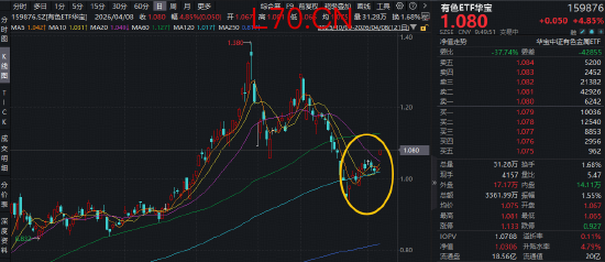 今日(4月8日)有色金属板块领涨两市,揽尽有色金属行业龙头的有色ETF华宝(159876)跳空大涨,场内价格猛拉4.85%,盘中收复5日、20日均线。